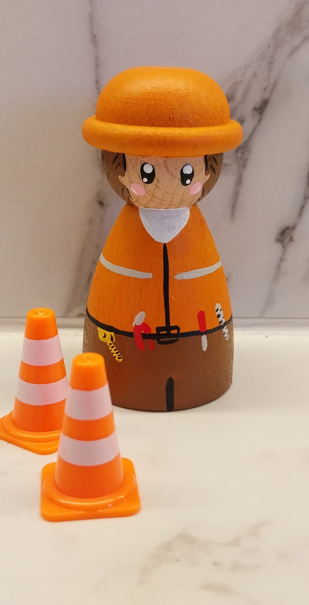 De bouwvakker peg doll past perfect bij alles wat met bouwen en wonen te maken heeft. Een unieke met de hand beschilderde bouwvakker.