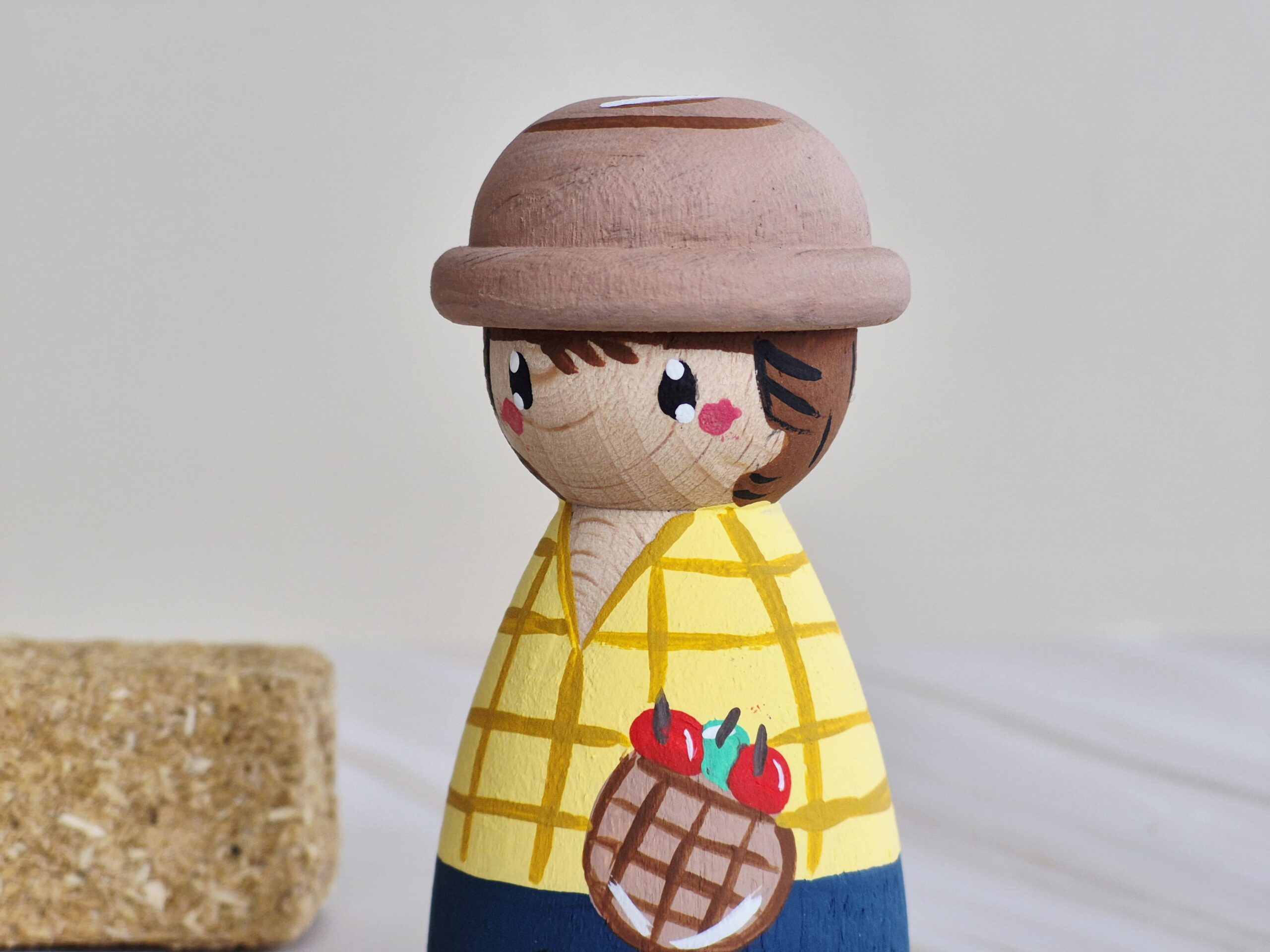 De boer peg doll past perfect bij alles wat met natuur, lente en dieren te maken heeft. Een unieke met de hand beschilderde boer met hooibaal.
