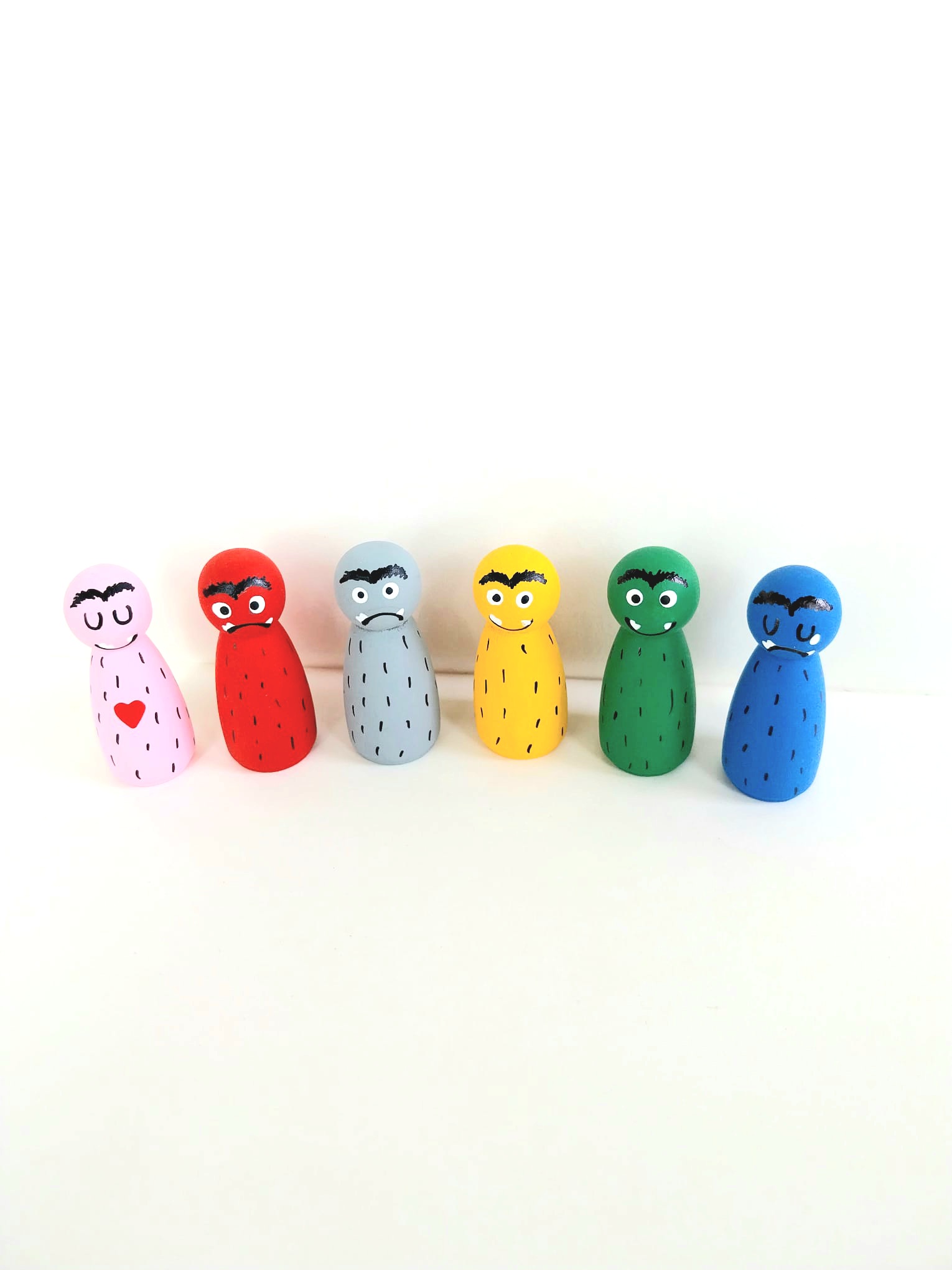 De kleurenmonsters peg doll set passen perfect bij elk thema over gevoelens, emoties of aan de start van je schooljaar! Een unieke met de hand beschilderde set van 6 kleurenmonster die elk een andere emotie hebben.