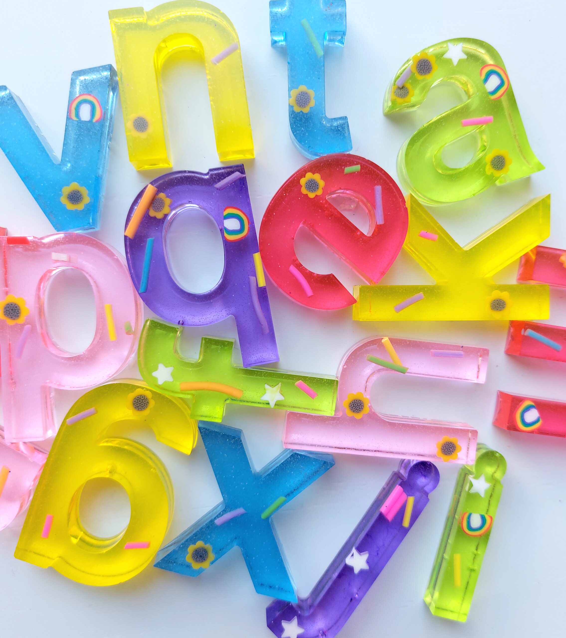 Deze prachtige regenboog glitterletters en glittercijfers zijn de perfecte aanvulling voor bij het sensorische spel. De letters en cijfers zijn gemaakt van verschillende kleuren epoxy met glitters, sprinkles, bloemen en regenboogjes. Ze zijn hard en daardoor inzetbaar met allerlei sensorische materialen zoals water, zand, waterparels en gekleurde rijst. Laat de kinderen spelend kennis maken met de letters en letters door ze te verstoppen in een bak met sensorisch materiaal. De letterset van a-z kost €15,95. De cijferset van 0-10 kost €11,95